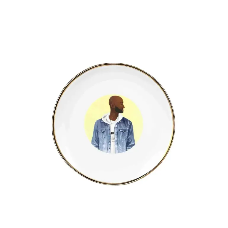Questo piatto raffigura Virgil Abloh lo stilista di Louis Vuitton e Off-White che ha rivoluzionato lo stile contemporaneo.
