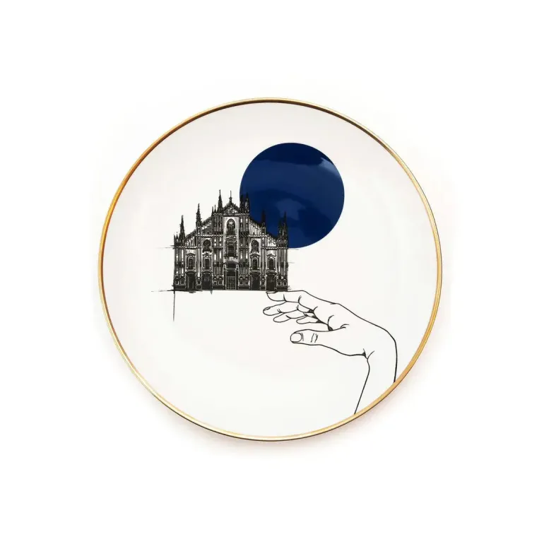 Il Piatto Milano è un omaggio alla città di Milano e, in particolare, al suo inconfondibile Duomo, uno dei massimi esempi di architettura gotica in Italia e nel mondo. La scelta del colore blu notte per la porcellana richiama la solennità e la serenità che emanano dal Duomo al calare della sera, mentre le guglie rappresentate con maestria sul piatto si ergono fieramente, simbolo della grandezza architettonica e spirituale della cattedrale.